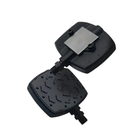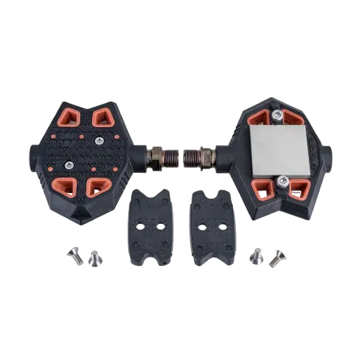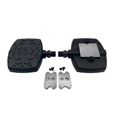 La Shark est composée de deux faces pour une polyvalence maximale. D’un côté, une face traditionnelle dotée de picots intégrés sur toute la surface assure une excellente adhérence, peu importe le type de chaussure utilisé. De l’autre, une face magnétique puissante compatible avec les cales SPD (fournies), offrant un maintien intuitif et sécurisé du pied dans toutes les conditions.